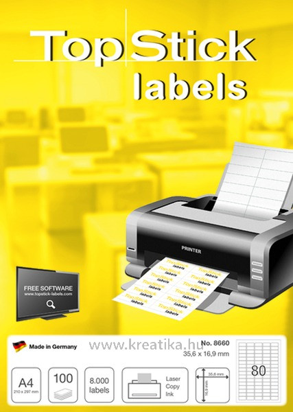 Hófehér, kiváló tapadású univerzális etikett , lézer-, tintasugaras nyomtatókhoz és fénymásológépekhez egyaránt ajánlott. 80 etikett/lap, 100 lap/doboz, 8660
