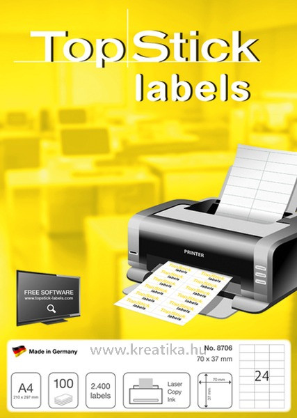 Hófehér, kiváló tapadású univerzális etikett , lézer-, tintasugaras nyomtatókhoz és fénymásológépekhez egyaránt ajánlott. 24 etikett/lap, 100 lap/doboz, 8706