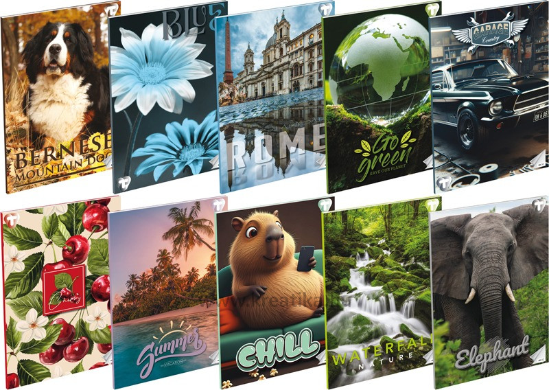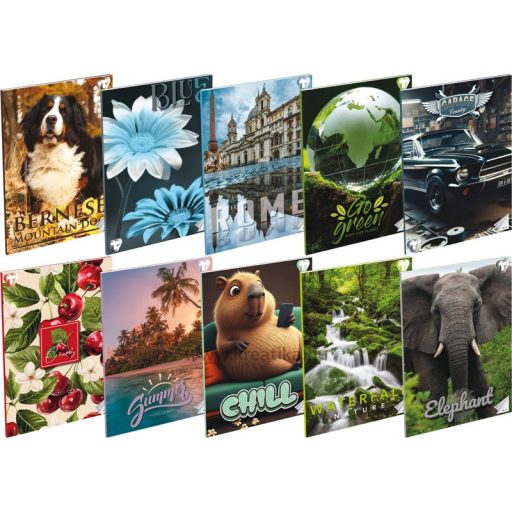 32 lapos, 70g-os hófehér belív. 200 g-os műnyomó borító + fényes fólia. Magyar szabványnak megfelelő vonalazás. 20 db/csomag, vegyes mintákkal.