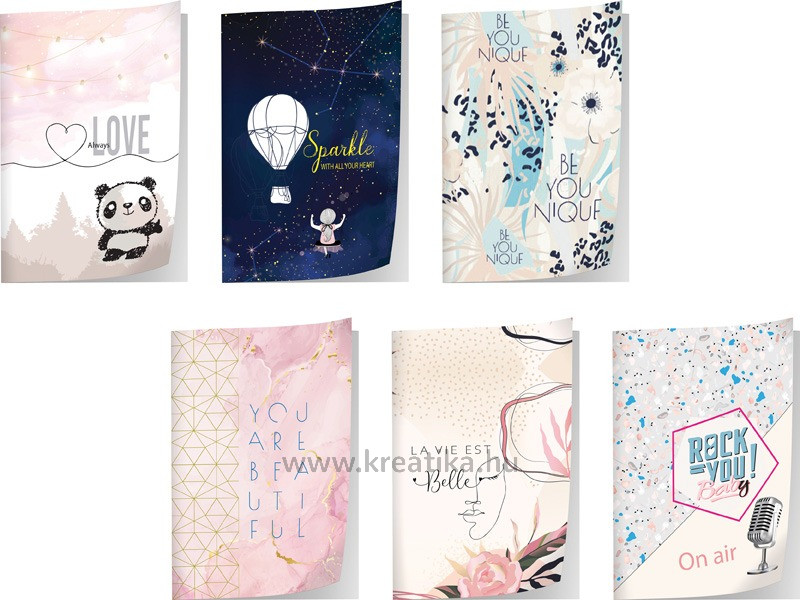 52 lapos kiváló minőségű füzet. 80 g-os hófehér belív, 300 g-os borítóval. 6 minta / kollekció.