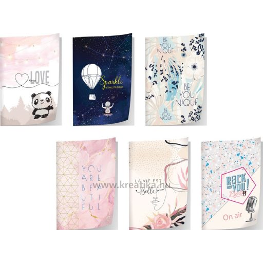 52 lapos kiváló minőségű füzet. 80 g-os hófehér belív, 300 g-os borítóval. 6 minta / kollekció.