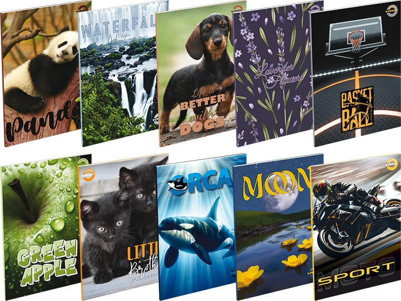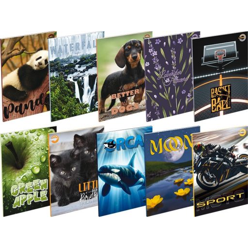 60 lapos tűzött füzet, 70 g-os hófehér belív. 250 g-os műnyomó borító. Magyar szabványnak megfelelő vonalazás. 10 db/csomag