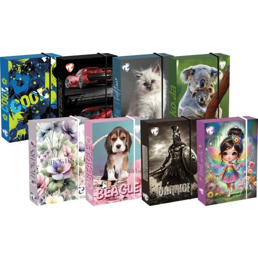 Fényes fóliázott, 1200 g/m2-es kemény karton alapanyag. Széles fekete vagy fehér gumipánttal. Folyamatosan megújuló minták.