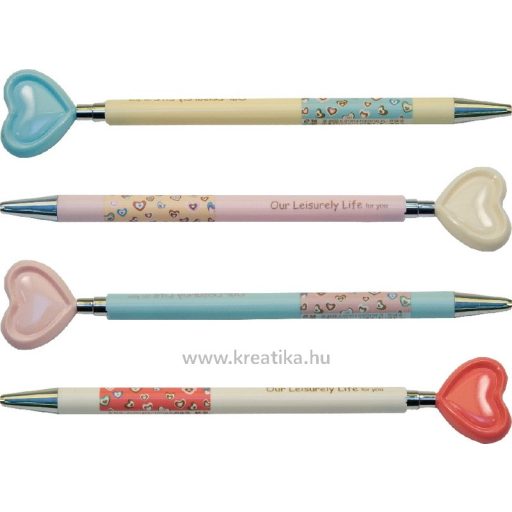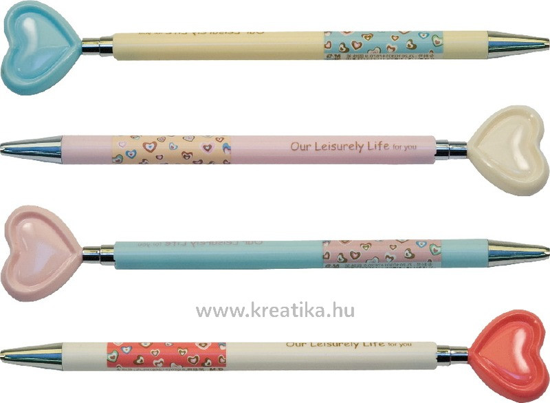 Műanyagm mintás tolltest. Műanyag, szív alakú nyomógomb. 0,38 mm es golyóátmérő, fém írócsúcs.