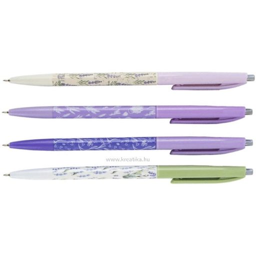 Levendula mintás műanyag tolltest. Színes, műanyag klip, ezüst színű nyomógomb. Nyomógombos szerkezet. 0,38 mm golyóátmérő. Kék tinta.