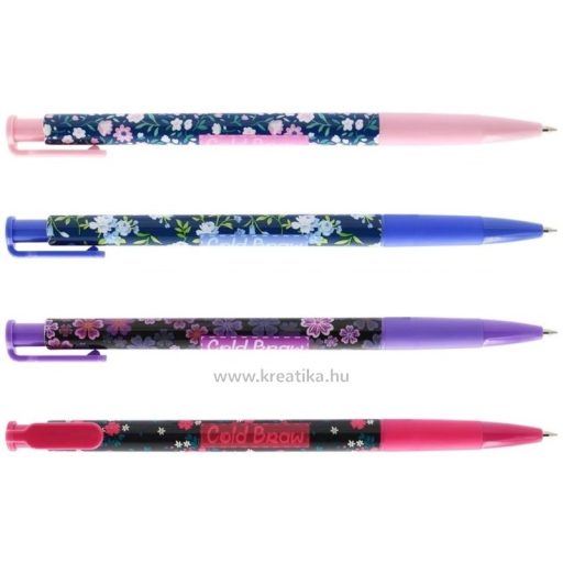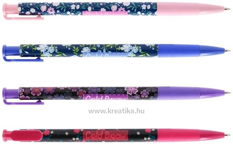 Mintás műanyag tolltest, nyomógombos szerkezet, gumírozott fogórész. Színes, műanyag klip, nyomógomb és tollvég.