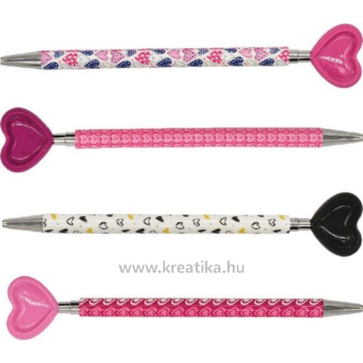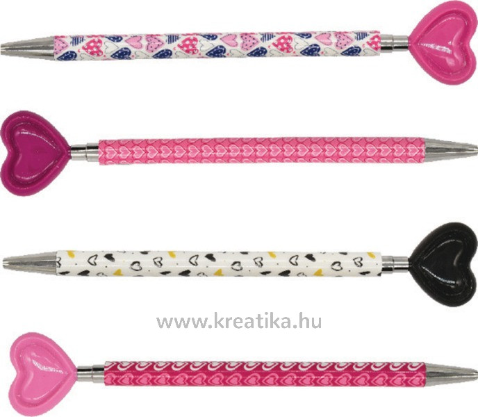 Műanyag mintás tolltest. Műanyag, szív alakú nyomógomb. 0,5 mm es golyóátmérő, fém írócsúcs.