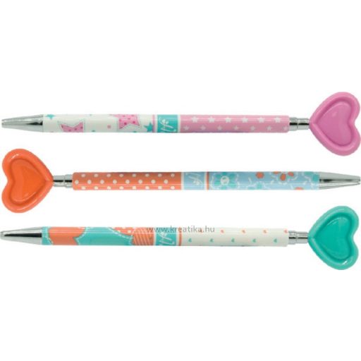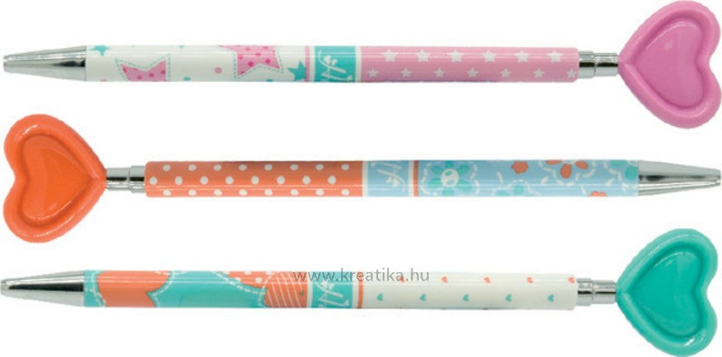 Műanyag, mintás tolltest, nyomógombos szerkezet. Műanyag, szív alakú nyomógomb, fém írócsúcs.