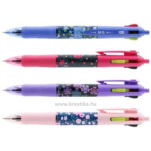 Műanyag tolltest, a toll az adott szín gombjának lehúzásával kapcsolható be. Gumírozott fogórész, nyomógombos szerkezet. 4 színes (kék, fekete, zöld, piros).