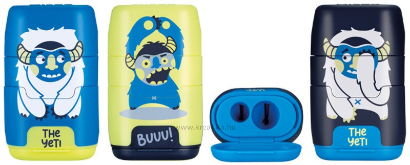 Modern design. 2 lyukú hegyező, normál és vastag méretű ceruzákhoz. Műanyag hegyezőtest. Beépített, cserélhető radírral. A hegyező rész kupakkal zárható.