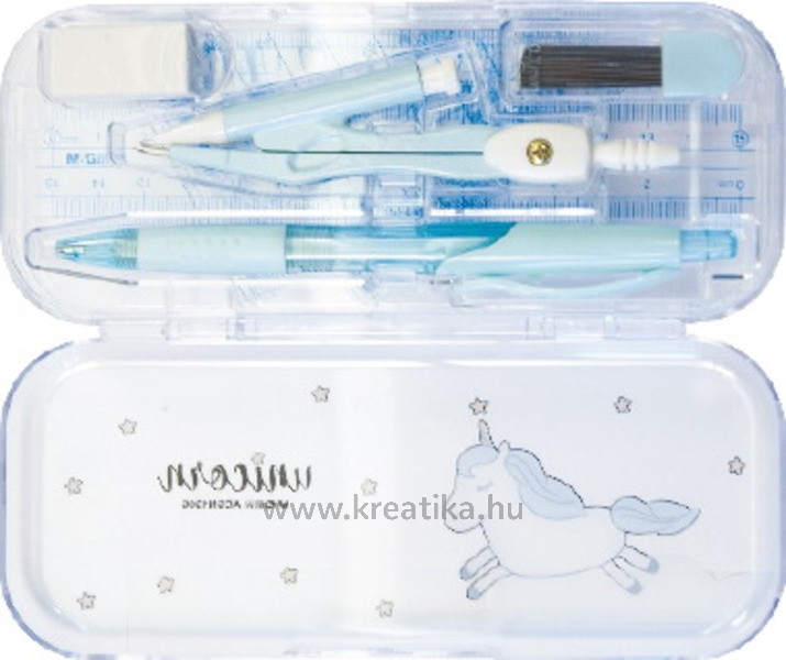 Áttetsző, unikornis mintás műanyag doboz. Tartalom: körző 0,5-ös ceruzával, 0,7-es nyomósirón, ceruzabetét 0,7-es, radír, 15 cm-es vonalzó, 60/100 és 45/100-as háromszög vonalzó, szögmérő 180/100.