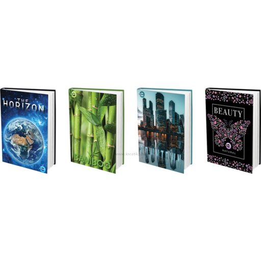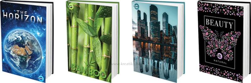Keménytáblás, cérnafűzött, A/4-es méretű, 48 lapos napló. 70 g-os hófehér belívek, magyar szabványnak megfelelő vonalazással. Változatos mintákkal. Méret: 210x300 mm.