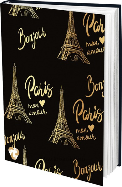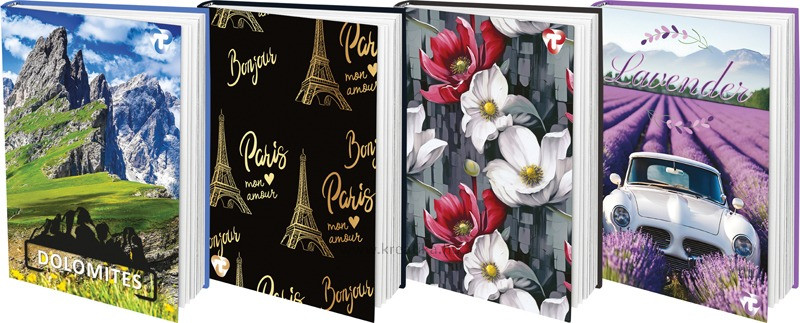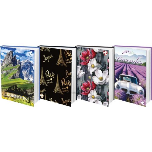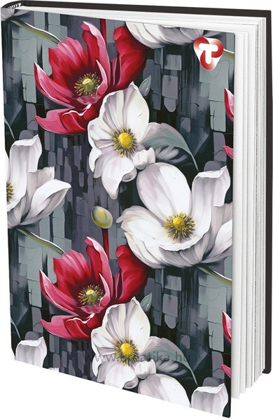 Keménytáblás, cérnafűzött, A/4-es méretű, 48 lapos napló. 70 g-os hófehér belívek, magyar szabványnak megfelelő vonalazással. Változatos mintákkal. Méret: 210x300 mm.