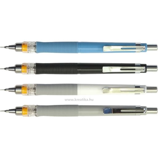 Műanyag ceruzatest, nyomógombos szerkezettel. Bordázott, ergonomikus fogórész, beépített radír. Fém klip és csúcs, illetve nyomógomb. A csúcs x található szerkezetnek köszönhetően, állítható a hegyadagoló által kinyomott ceruzabetét hossza. Folyamatos hegyadagolás.