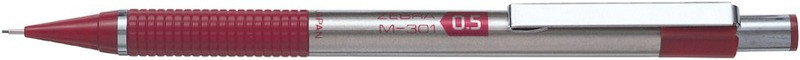 Rozsdamentes acélból készült mechanikus ceruza. Műanyag, bordázott markolat. Beépített radír.