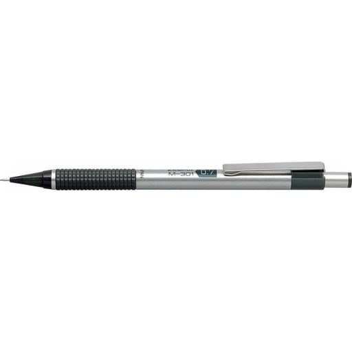 Rozsdamentes acélból készült mechanikus ceruza. Műanyag, bordázott markolat. Beépített radír.