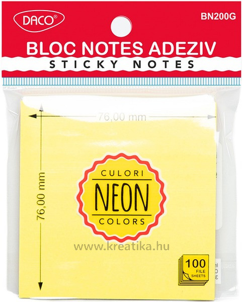 Öntapadó jegyzettömb 76x76 mm 100 lap Daco neon sárga
