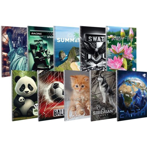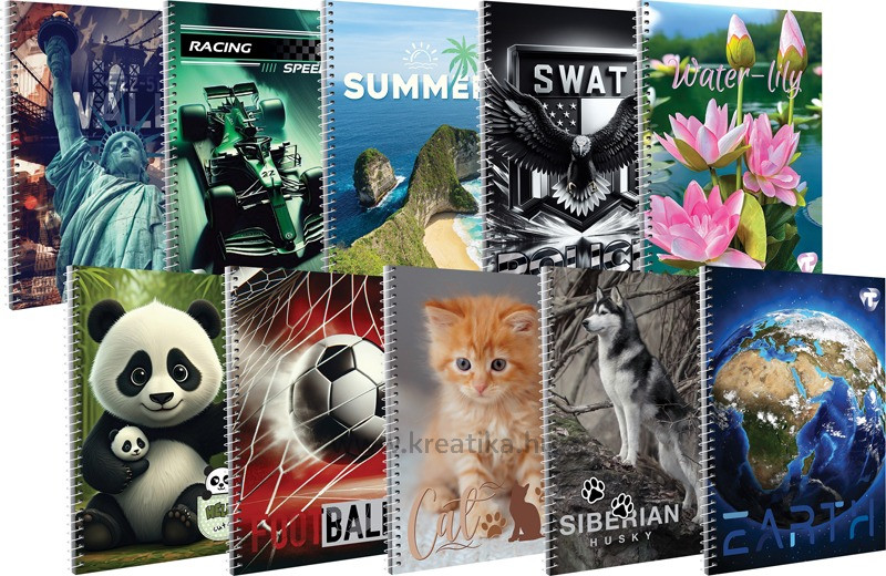 275 g-os karton borító + fényes fólia. 70 g-os hófehér lapok. Visszaforduló spirálozási technika. Magyar szabványnak megfelelő vonalazás. Változatos, folyton megújuló minták.