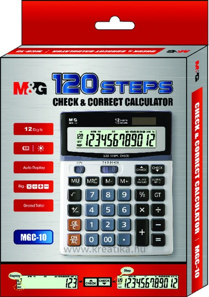 asztali számológép • 12 számjegyes • 120 lépéses check&correct funkció • dönthető LCD kijelzővel • százalékszámítás • 2 nulla gyors hozzáadása • •ad atbevitel helyesbítése • gyökvonás • végösszeg számítás • tizedeskerekítés tizedes beállítás • memória funkció • törlés a memóriából • hozzáadás a memóriához • elem+napelem • méret: 19x16x4,5 cm