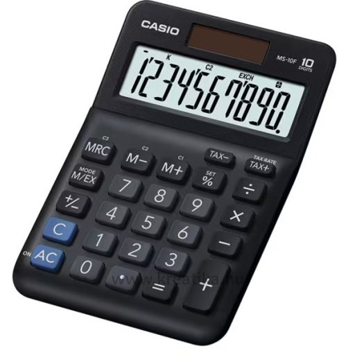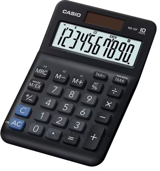 10 számjegyű, nagy, döntött kijelzővel, ÁFA számítás, valutaátváltás, elem+napelem, %, +/-
