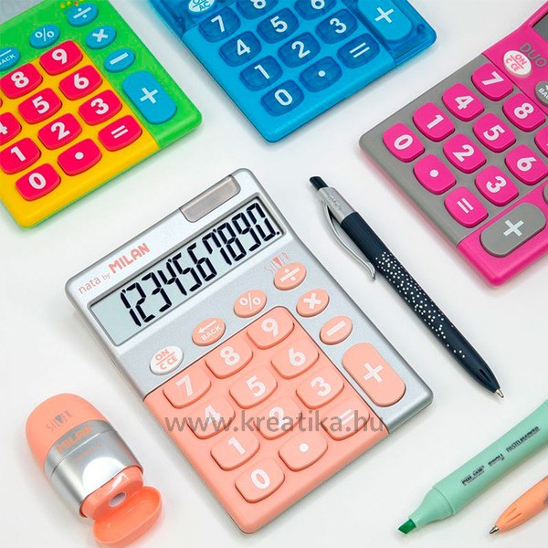 10 számjegyes asztali számológép. Döntött kijelző. Százalék-, négyzetgyök- és árrés számítás. Teljes összeg megtekintése/törlése. Adatbevitel helyesbítése. Memóriafunkció.