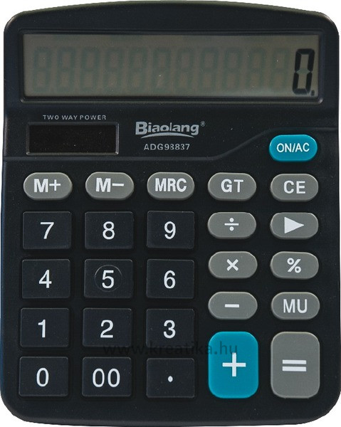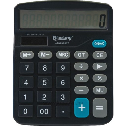 Asztali számológép, 12 számjegyes LCD kijelzővel. Százalékszámítás, memória funkció, adatbevitel helyesbítése, haszonkulcs, 2 nulla gyors hozzáadása. Napelem + gombelemmó, méret: 11,8x14,8x2,4 cm.