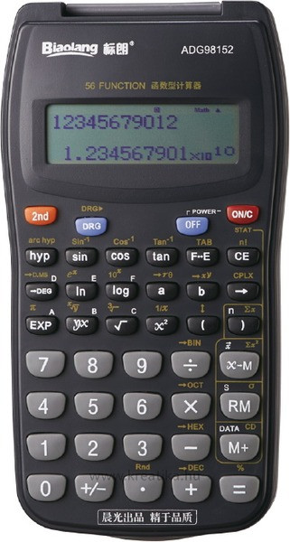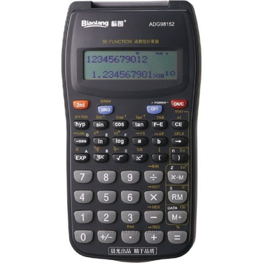 Tudományos számológép, 10 (+2) számjegyes, 56 funkció. Nagy, kétsoros kijelző, műanyag tok. Százalékszámítás, logaritmus funkció, memória funkció, statisztikai számítások, kombináció, permutáció, négy aritmetikai lehetőség, négyzetgyök, köbgyök, gyök, négyzet, hiperbolikus/inverz.