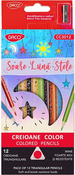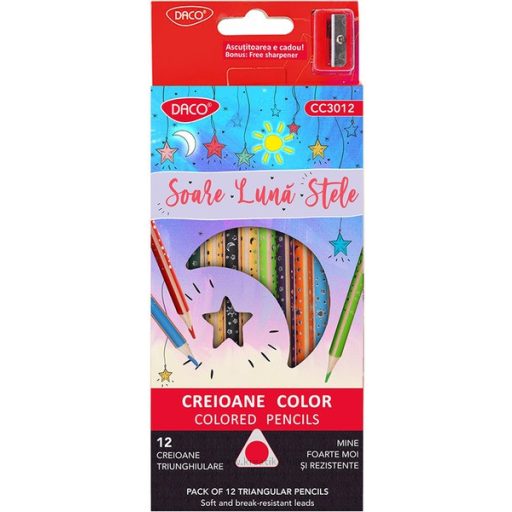 Színesceruza készlet, ajándék hegyező Daco "Soare Lună Stele" 12 szín