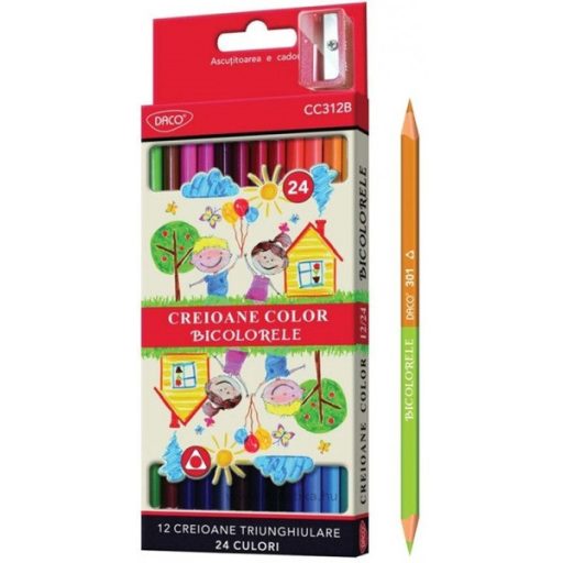 Színesceruza készlet kétvégű, háromszög test, ajándék hegyező Daco 12 szín