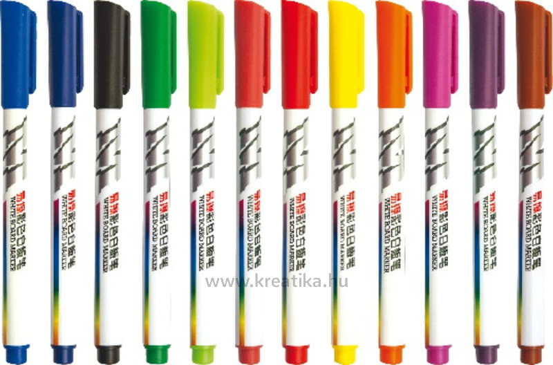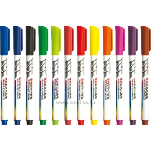 Szárazon törölhető táblafelületeken alkalmazható. Gyorsan száradó, szagtalan, alkoholos tinta. Könnyedén törölhető. Ventilációs kupak, mely meggátolja az esetleges fulladást. Hengeres filctest. 12 es készlet. 1 mm es vonalvastagság.