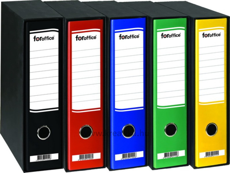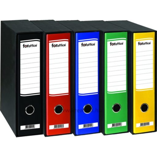 Fekete karton tok, színes, a tokból kiemelhető emelőkaros iratrendező, ragasztott címke, erősített kihúzólyuk.