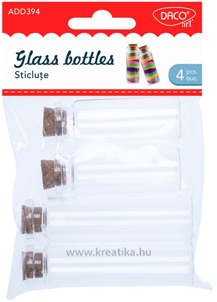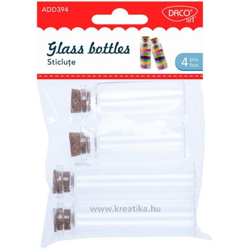 A készlet 4 átlátszó üvegpalackot tartalmaz, mindegyik természetes parafa dugóval, így ideálisak személyre szabott dekorációk vagy egyedi kiegészítők készítéséhez. Méretek: 6,5 cm x 2 cm és 8,5 cm x 2 cm