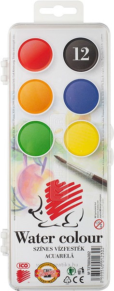 Élénk színű, műanyag tokos vízfesték. 30 mm-es átmérőjű korongok. SÜNIS.