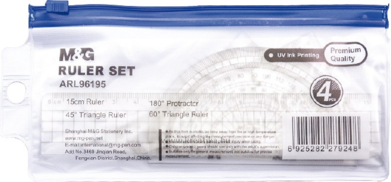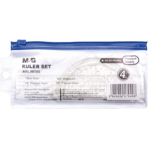 Prémium minőségű alapanyag. Visszazárható műanyag tasakban. 4 db os szett: 1 db 15 cm es, 1 db 60°-os háromszög és 1 db 90°-os háromszög vonalzó, és 1 db szögmérő..