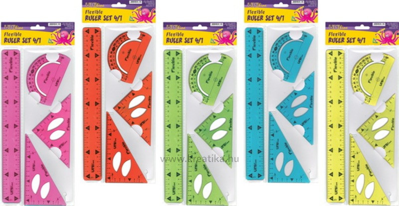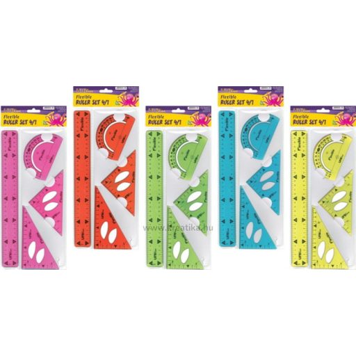 Flexibilis vonalzókészlet (4 db-os). Divatos színekben. A vonalzó hajlítható anélkül, hogy az alapanyag sérülne. 1 db 30 cm-es vonalzó, 1 db 60°-os háromszög vonalzó, 1 db 45°-os vonalzó, 1 db szögmérő.