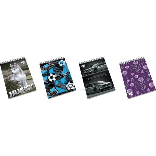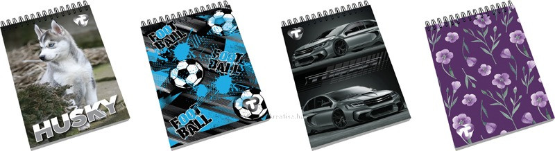 275 g-os karton borító + fényes fólia. 70 g-os hófehér belív. Dupla spirál. Magyar szabványnak megfelelő vonalazás. 40 lapos. 4 féle minta vegyesen.