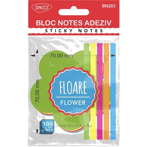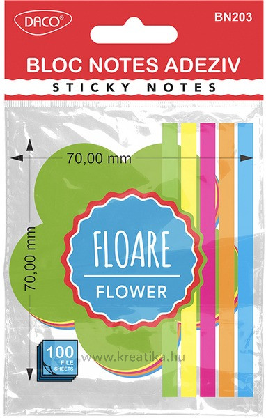 Virág minta, élénk színű (zöld, sárga, fukszia, narancs, kék), 100 lapos, jegyzettömb. Biztonságosan tapad sima felületekre anélkül, hogy foltot hagyna, és könnyen eltávolítható.