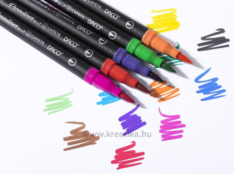 Ideális kreatív tevékenységekhez, színezéshez és finom kontúrozáshoz. Rugalmas ecsetvégével és 0,4 mm-es hegyével kiválóan kontrollálja a részleteket, a fémvédő pedig ideálissá teszi vonalzókhoz vagy sablonokhoz. Vízbázisú tinta..