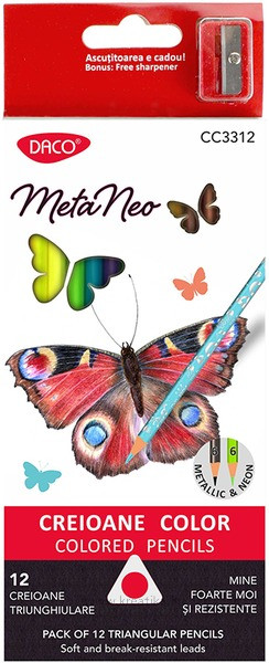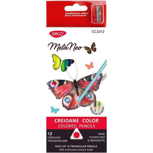 Neon Metallic ceruzakészlet, 12 élénk és látványos színben. Minden ceruza a ragyogó neon árnyalatot stílusos metál tónussal ötvözi, így egyetlen mozdulattal számos kreatív lehetőséget kínál. Az ergonomikus háromszög alakú test kényelmes és pontos fogást biztosít. Hegyzővel.