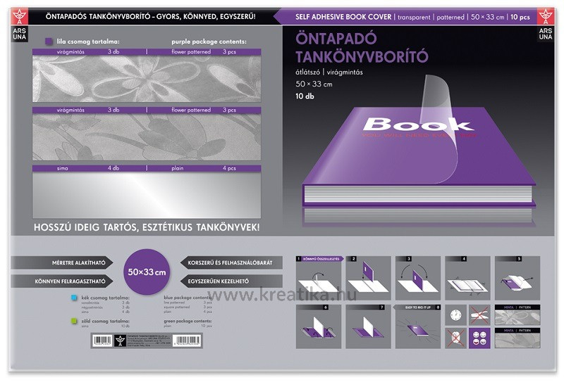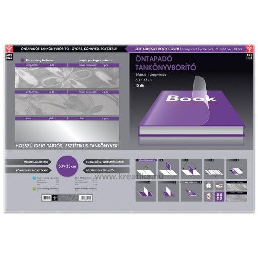 Öntapadós műanyag tankönyvborító, 50x33 cm méretű. Egy csomag 10 db átlátszó borítót tartalmaz. Méretre vágható. Tankönyvekhez és füzetekhez is használható.