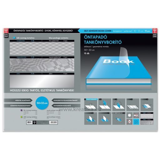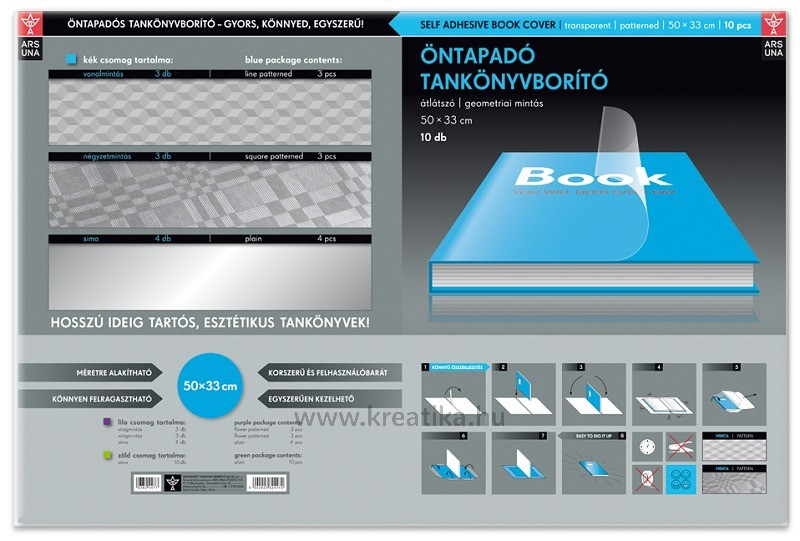 Öntapadós műanyag tankönyvborító, 50x33 cm méretű. Egy csomag 10 db átlátszó borítót tartalmaz. Méretre vágható. Tankönyvekhez és füzetekhez is használható.